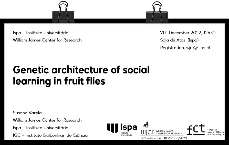 Dr. Susana Varela (WJCR, Ispa – Instituto Universitário; IGC – Instituto Gulbenkian de Ciência) will give a lecture entitled “Genetic architecture of social learning in fruit flies”.
