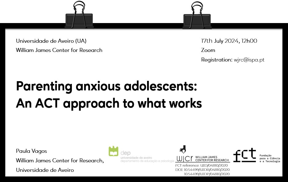Dr. Paula Vagos (William James Center for Research, Universidade de Aveiro) will give a lecture entitled “Parenting anxious adolescents: An ACT approach to what works”.