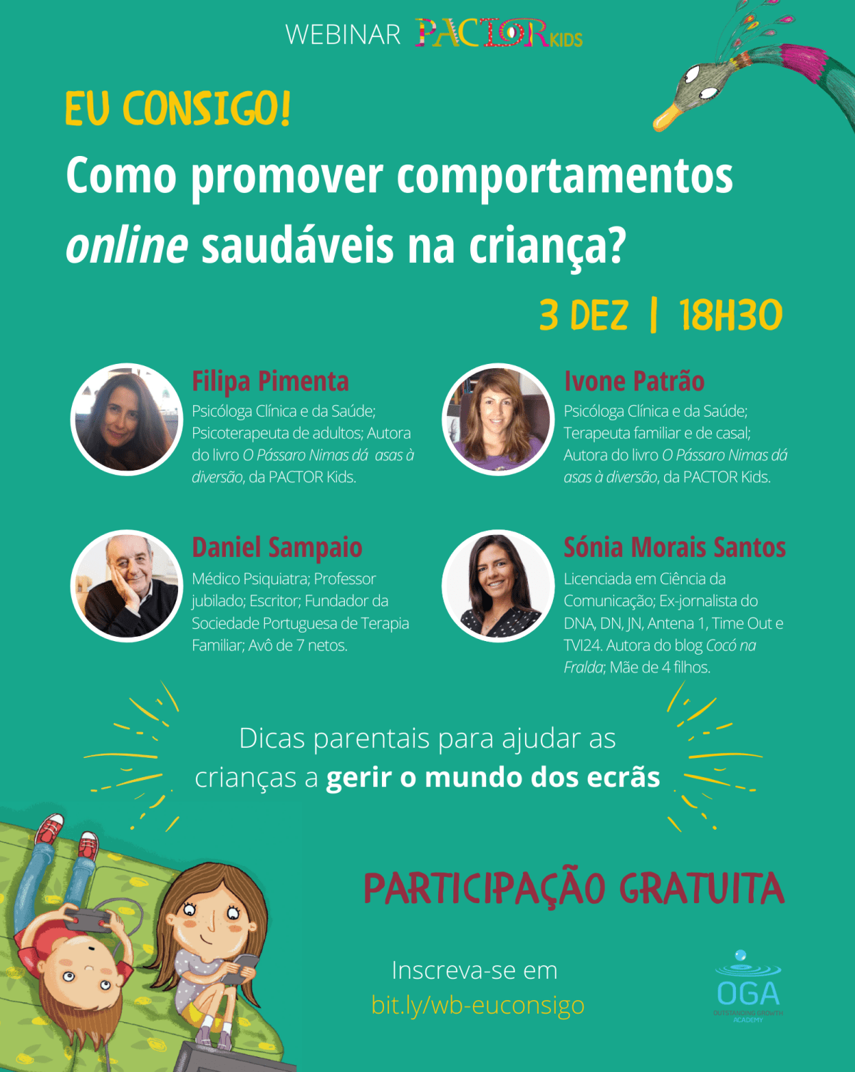 A investigadora WJCR Filipa Pimenta juntamente com a Professora do ISPA Ivone Patrão, co-autoras do livro “O Pássaro Nimas dá asas à diversão”, convidam Daniel Sampaio e Sónia Morais Santos (Cocó na Fralda) para uma conversa dirigida a todos os pais. O Webinar decorre no dia 3 de dezembro às 18h30.